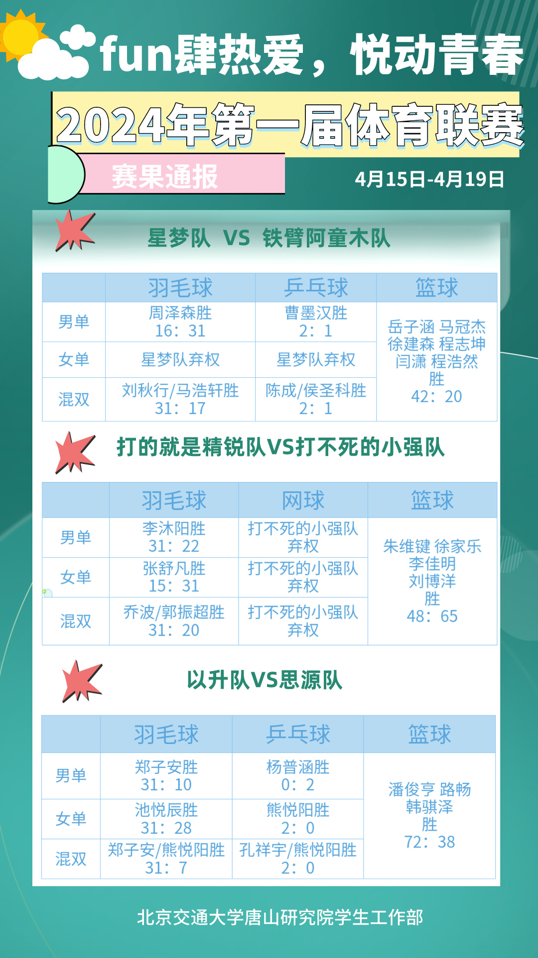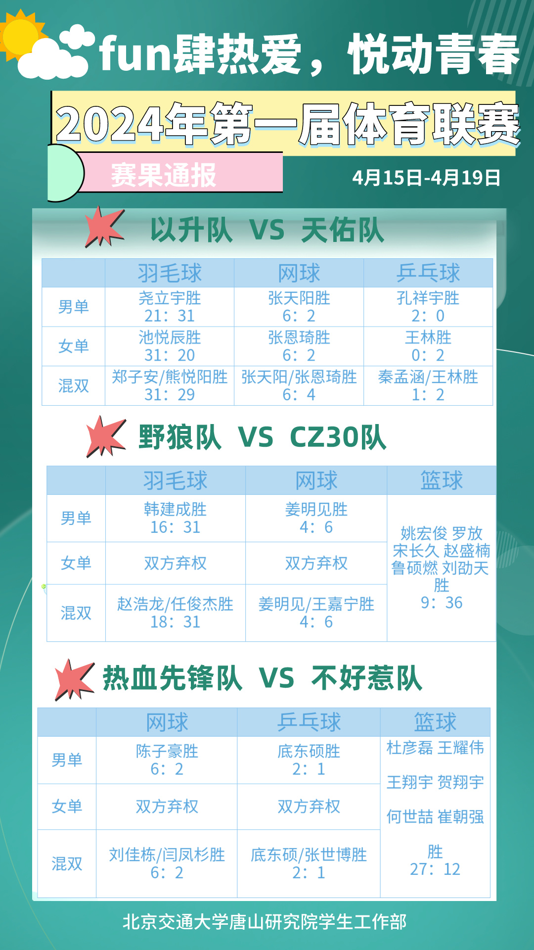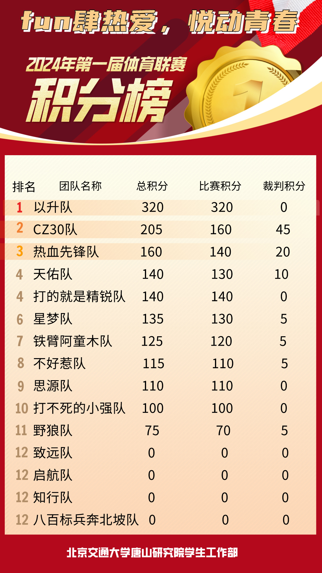 2024年唐山研究院第一届体育联赛赛果通报、积分榜