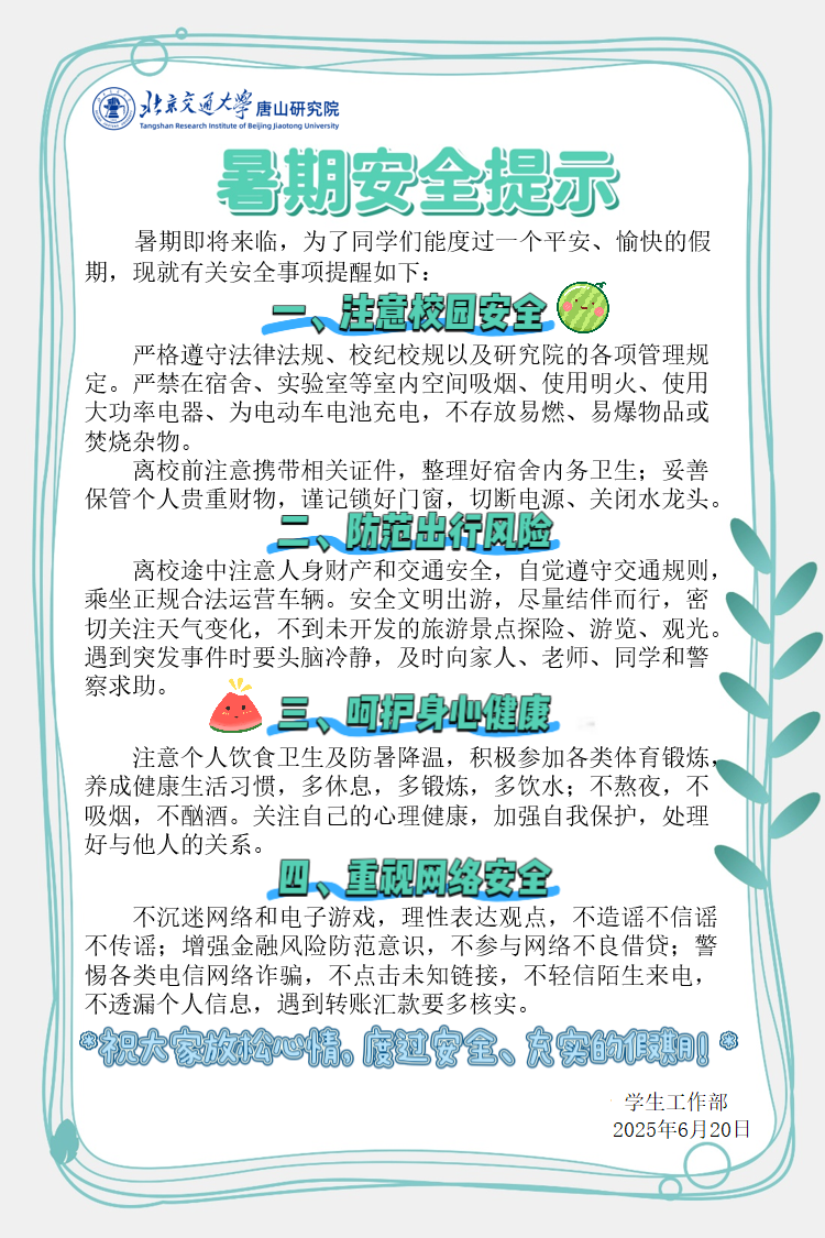 为做好学生离校期间的各项工作,教育引导学生坚定理想信念,明确奋斗目标,担当时代责任,锤炼品德修为,积极营造健康和谐、文明有序、积极向上的离校氛围,保证学生安全文明离校,现将具体工作通知如下:
