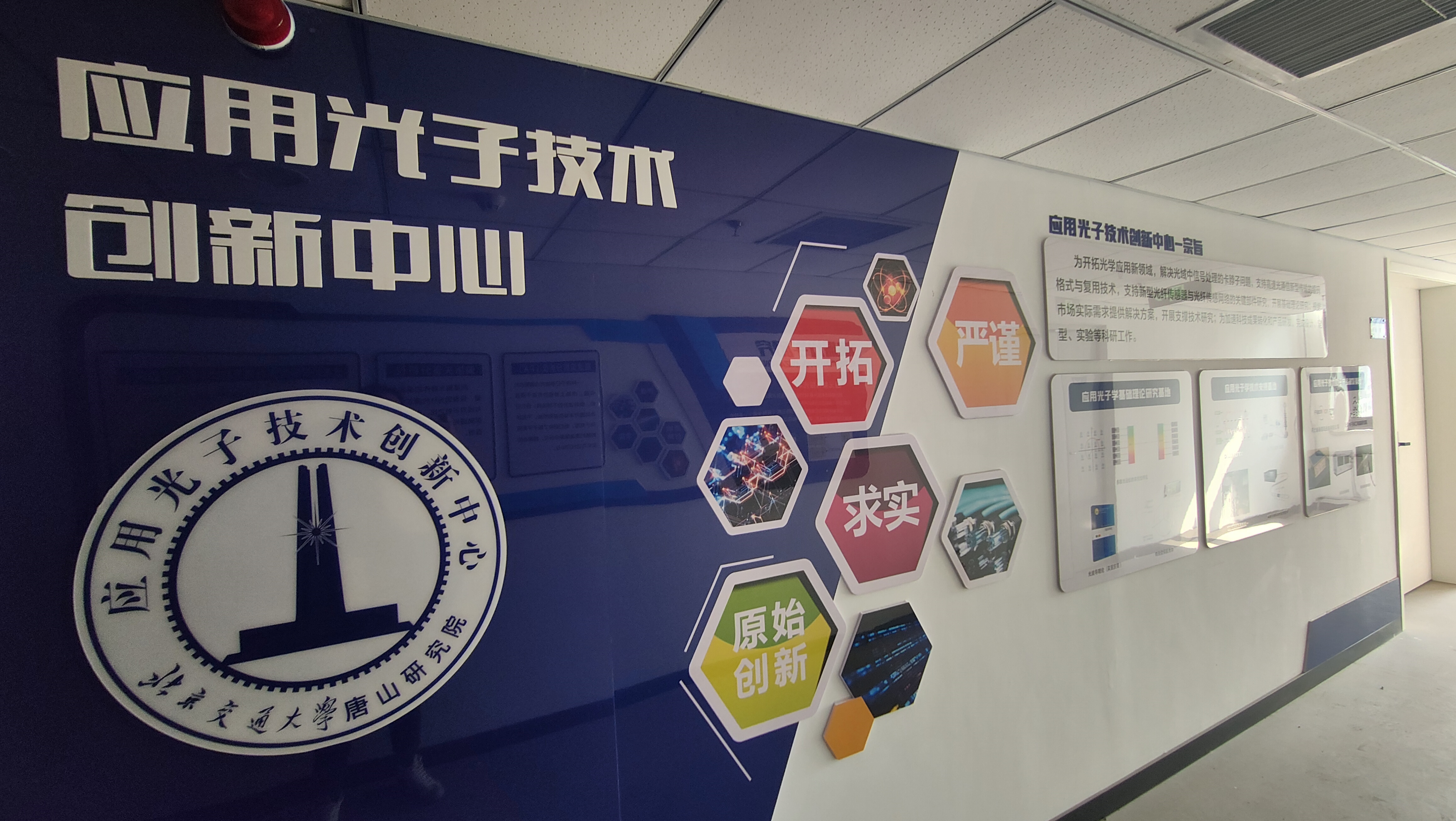 北京交通大学唐山研究院应用光子技术创新中心依托北京交通大学唐山研究院和南京恒高光电研究院,开展光域中信号处理、高速光通信领域等的基础理论和应用技术研究,致力于研究解决光域中信号处理的新机理与关键技术、支持高速光通信新型传输的编码格式与复用技术、下一代光网络性能核心设备的关键技术,研发出新型光纤传感器与光纤传感网络关键部件,推动科技成果转化与市场开发,提高相关领域的创新创造能力,建设高水平科技创新平台。中心负责人为吴重庆教授。