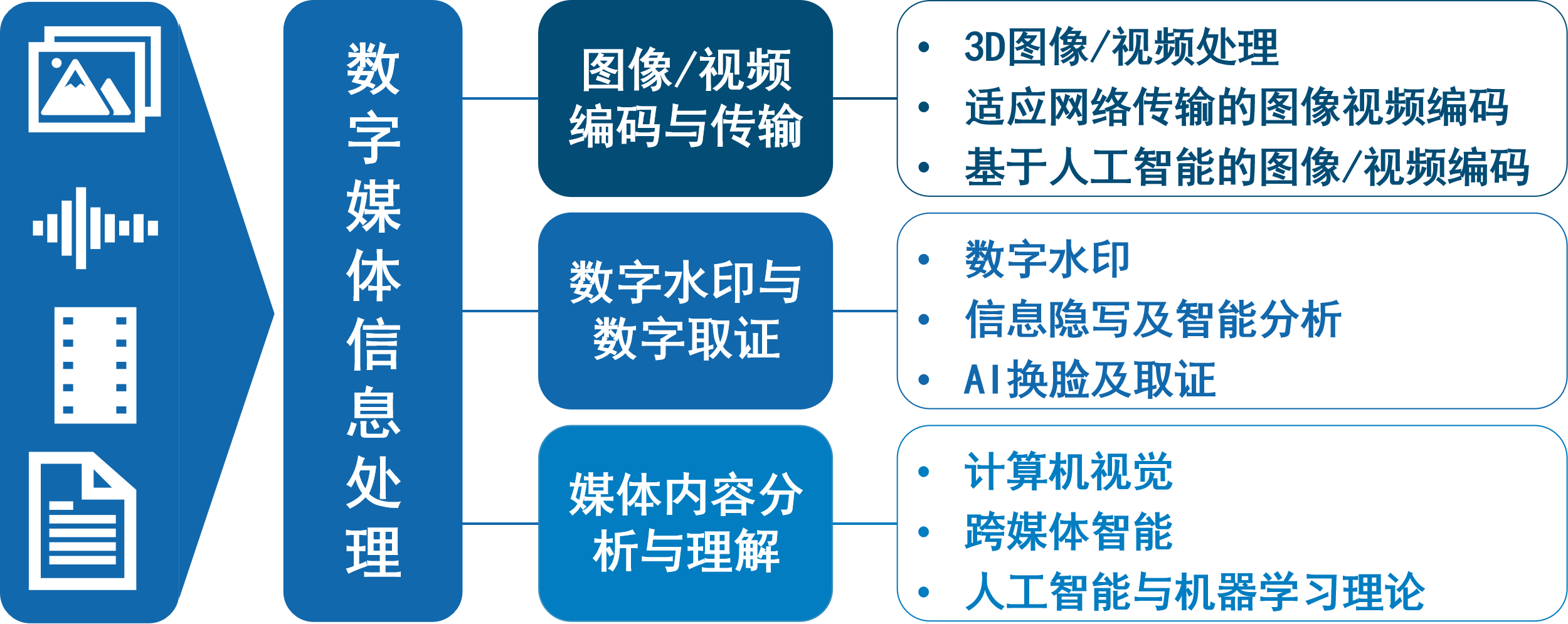 数字媒体信息处理研究中心紧跟媒体处理研究的国际前沿,承担了国家重点研发计划、国家重点基础研究发展计划(973课题)、国家高技术研究发展计划(863课题)、国家自然科学基金重大国际合作等重要课题,累计发表论文500余篇,发表论文相关成果发表在TPAMI、TIFS、TIP、TNNLS、TKDE、TMM以及NeurIPS、CVPR、IJCAI、ACM MM等国际重要期刊以及会议,获得了北京市科学技术奖一等奖、教育部自然科学奖二等奖、中国图象图形学学会科学技术奖一等奖等奖励。本中心同时也是高层次人才的培养基地,所培养的博士生6人次获北京市优秀博士论文奖、计算机学会优秀博士论文奖、中国电子学会优秀博士学位论文奖等。