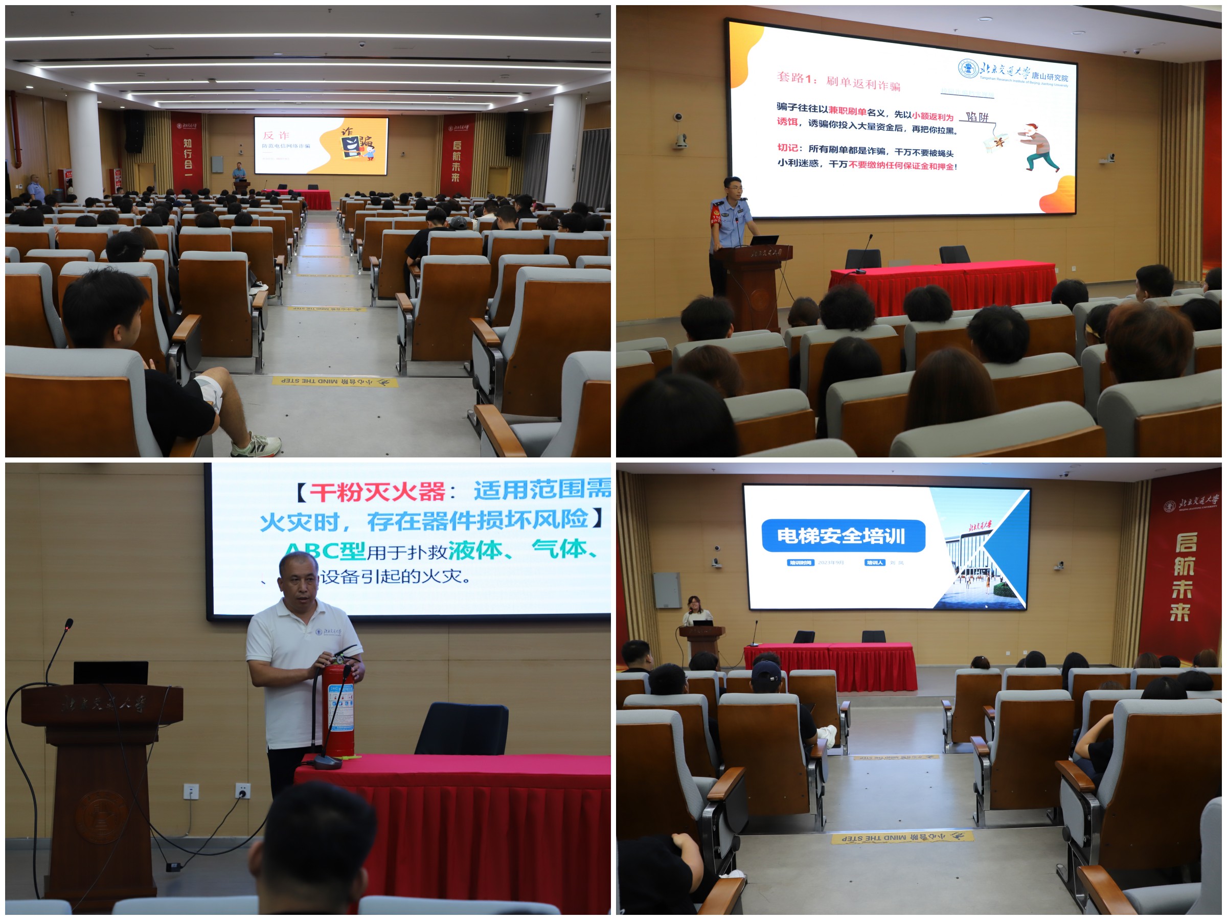 9月11日上午,学生工作部联合安全保卫部开展新生入学安全教育,活动邀请路南区广场派出所所长王蕊、广场派出所驻研究院民警张云飞,为同学们普及防范诈骗知识;安全保卫部孙振军老师讲解消防安全知识,刘凤老师讲解电梯安全知识。他们从身边真实的案例出发,用诙谐的语言分析了学生心理上安全意识的漏洞;以具体案例为切入点,用缜密的分析强调了反诈过程中应该重视的要点;以实际操作为关键点,用生动的操作展示了消防栓的正确使用;以生动视频为辅助点,用真实案例强调了电梯乘坐中的应该注意的事项。