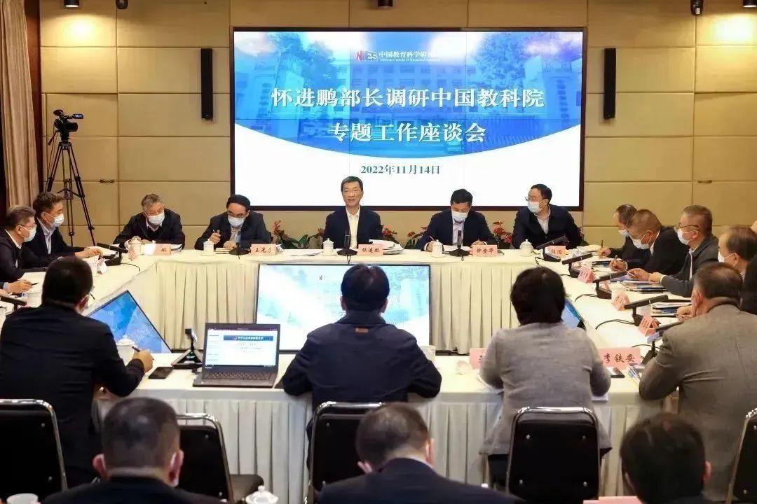 11月14日,教育部党组书记、部长怀进鹏在中国教育科学研究院调研教育科研工作情况,出席教育数字化专题座谈会,听取有关司局、单位国家智慧教育平台建设应用情况汇报和专家对推进教育数字化的意见建议并讲话。教育部党组成员、副部长钟登华主持座谈会。