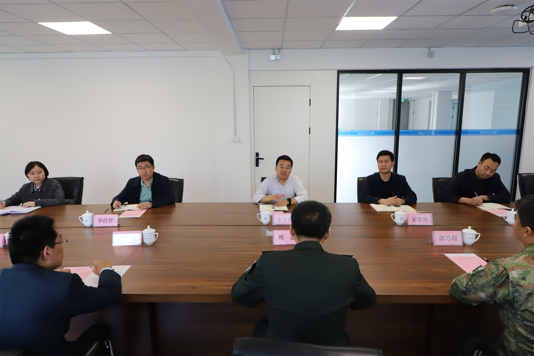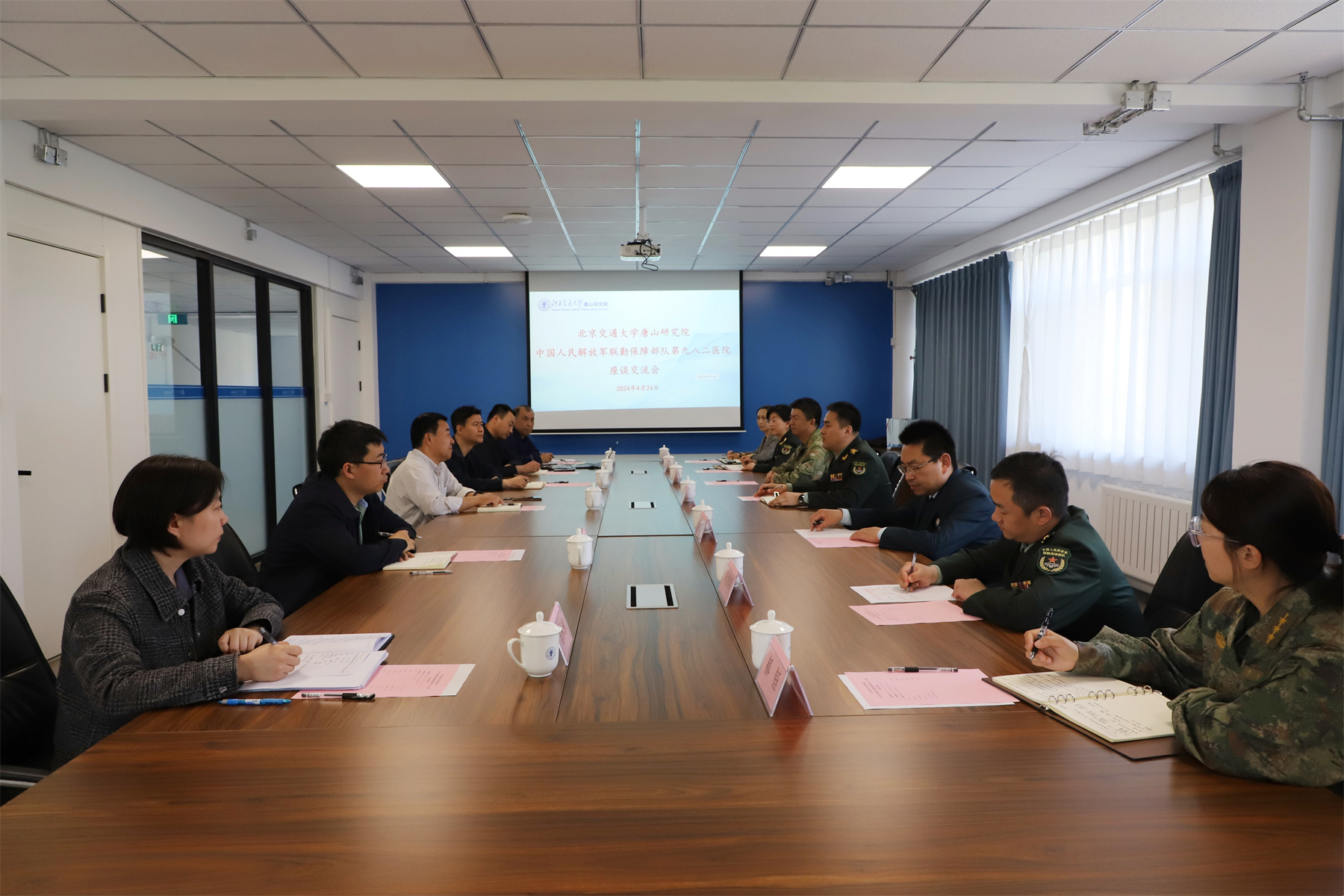 4月24日下午,中国人民解放军联勤保障部队第九八二医院院长刘流,副院长孙浩、郭乃超一行来到唐山研究院,双方就军民合作相关事宜进行座谈交流。唐山研究院院长王大勇、副院长董敬祝、院长助理李佳智陪同座谈。