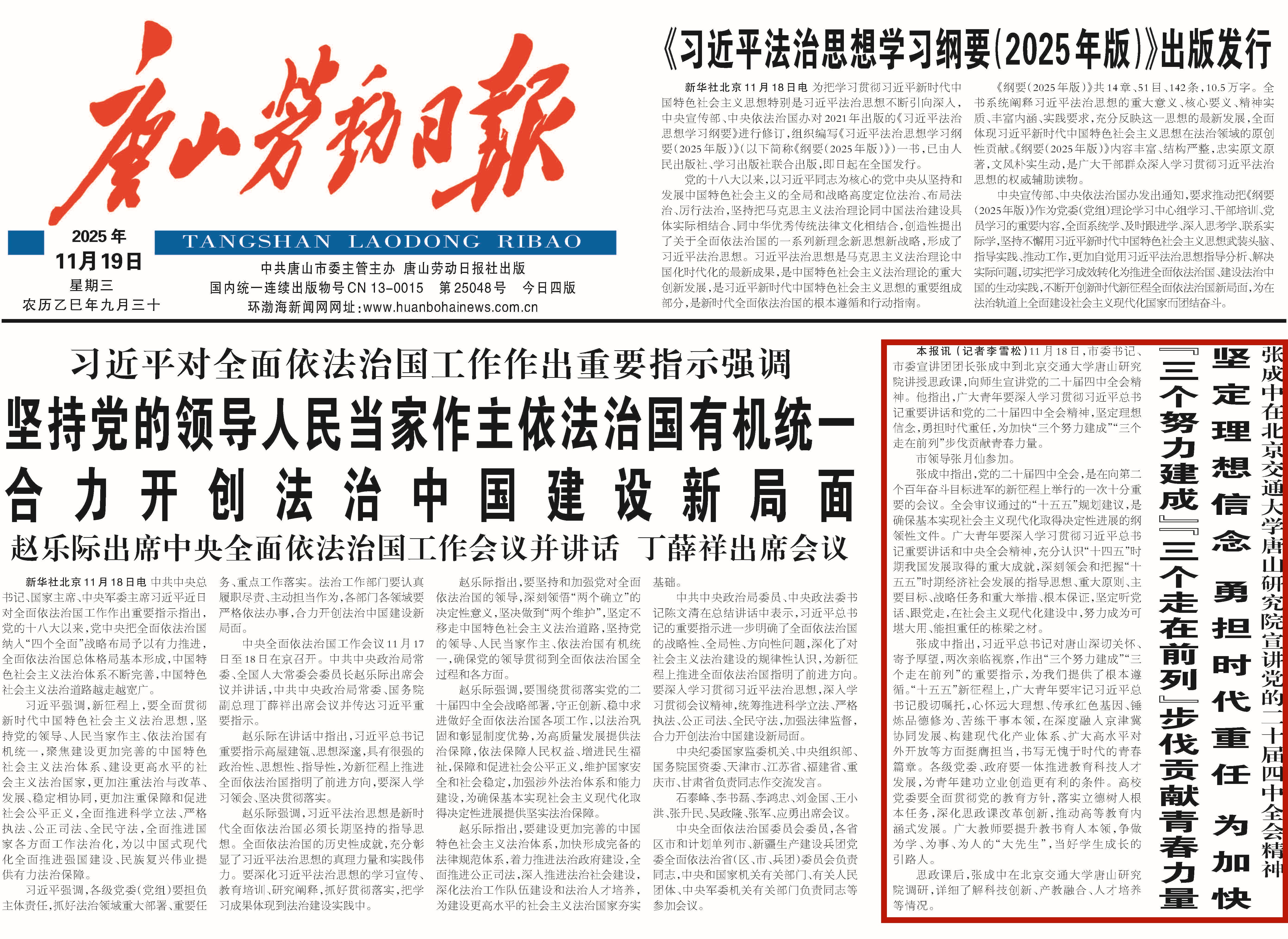 11月18日,河北省委常委、唐山市委书记、市委宣讲团团长张成中到北京交通大学唐山研究院讲授思政课,向师生宣讲党的二十届四中全会精神。他指出,广大青年要深入学习贯彻习近平总书记重要讲话和党的二十届四中全会精神,坚定理想信念,勇担时代重任,为加快“三个努力建成”“三个走在前列”步伐贡献青春力量。