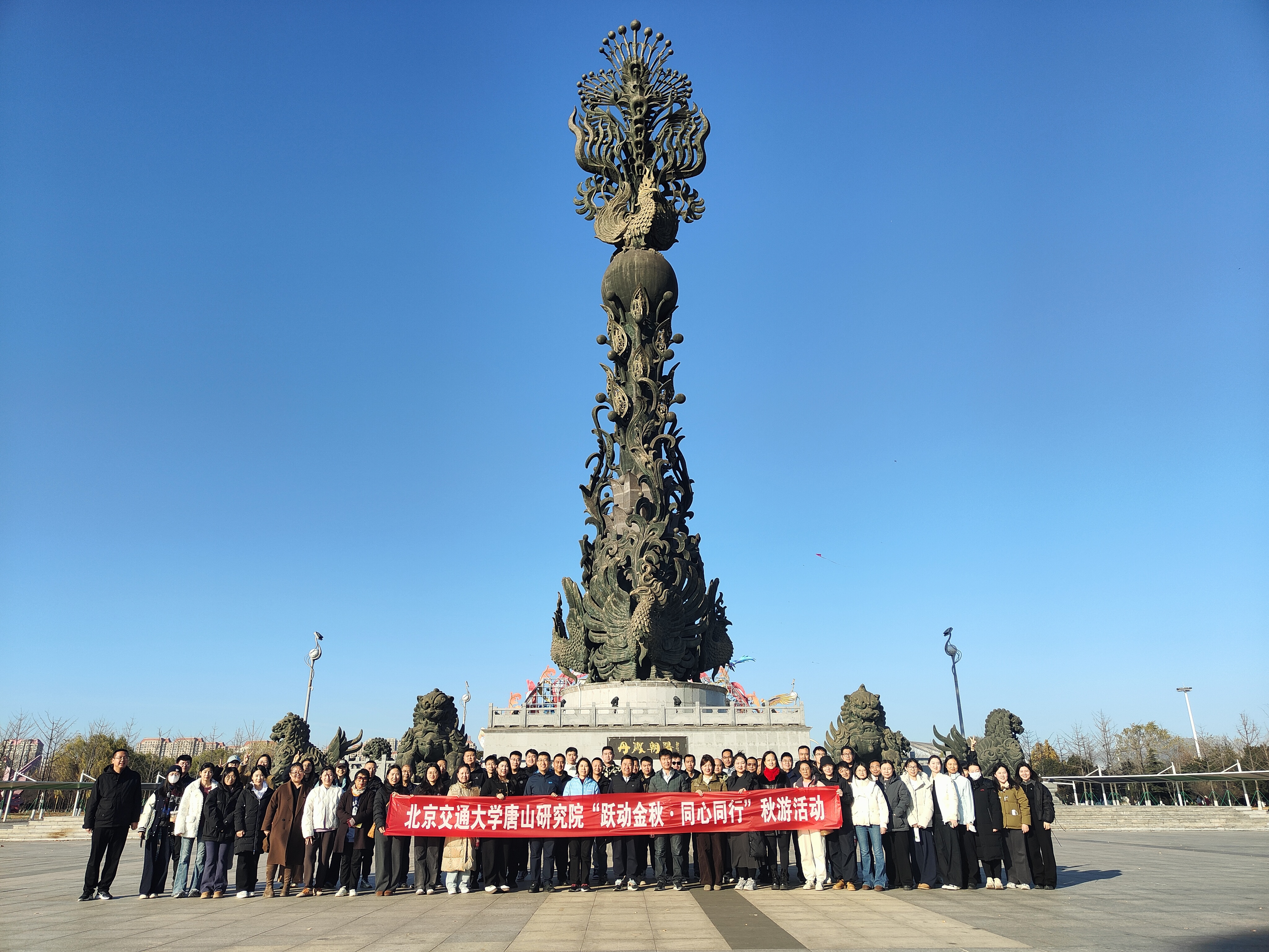秋光潋滟,叠翠流金。在丹凤朝阳广场集合后,大家漫步唐山南湖生态旅游景区,开启深秋之旅,探索唐山美景。湖水碧波荡漾,倒映着湛蓝的天空和轻盈的白云;岸边的红枫、黄杨、银杏等树木交织出五彩斑斓的画卷,每一笔都饱含着秋日的韵味。教职工们暂时停下繁忙的工作,在南湖深秋色彩迷人的诗意画卷中尽情游览,放松身心,感受这个由采煤沉降区生态修复而成的国家5A级旅游景区的深秋之美。在终点凤凰台顶的凤凰亭,大家登顶拍照,俯瞰南湖秋色,眺望唐山风光,将秋游的好心情、好风景定格在画面中。