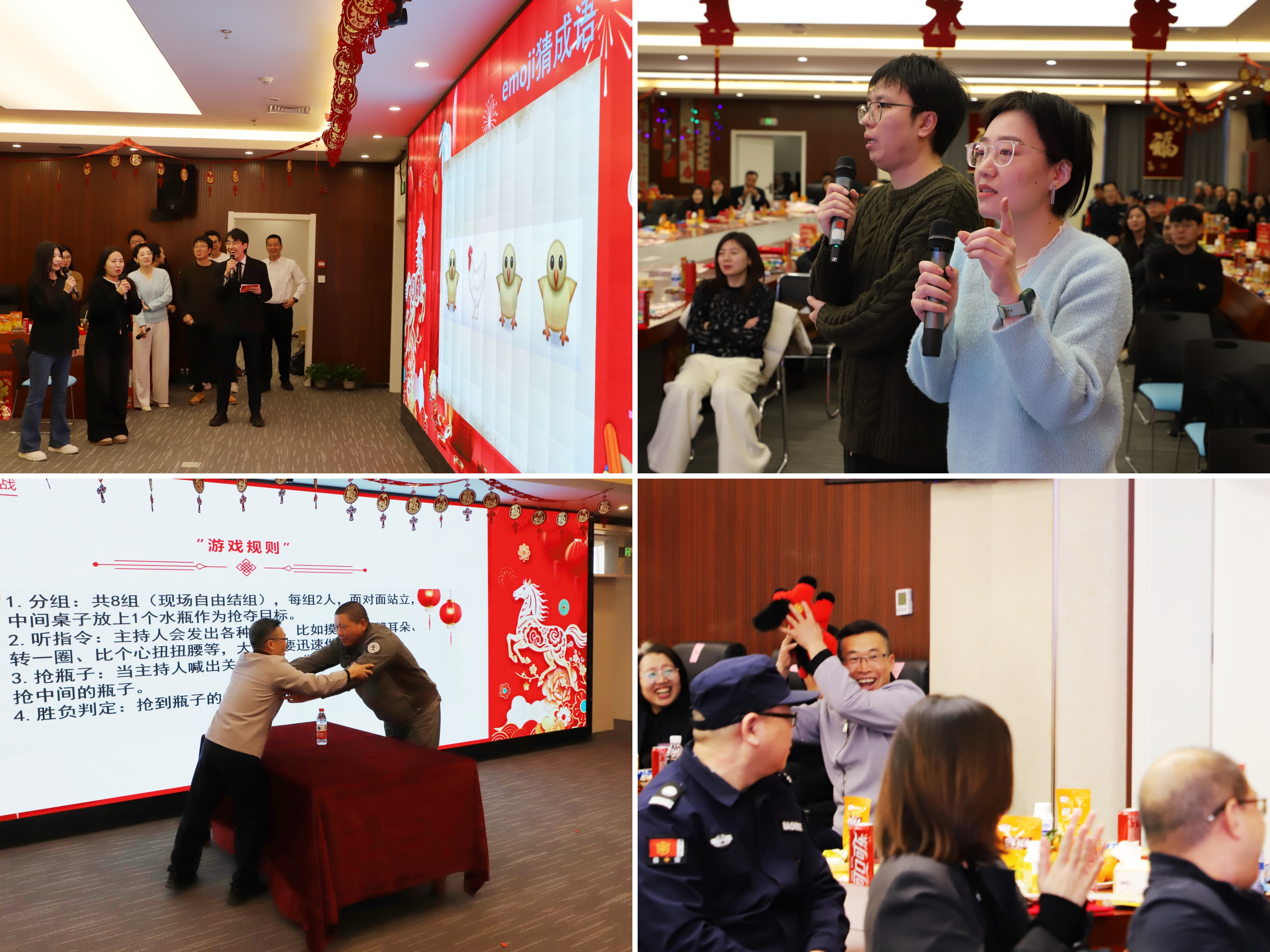 联欢环节以各部门负责人共同带来的诗朗诵《硕果盈枝辞旧岁 逐光而行启新程》徐徐展开。歌曲《知道不知道》、《送你一朵小红花》,配音《新闻晚知道》,脱口秀《随口“一”说》等教职工自编自演的精彩节目轮番上演。大家积极参与《emoji猜成语》、《抢瓶子大作战》等趣味游戏,现场欢声笑语不断。