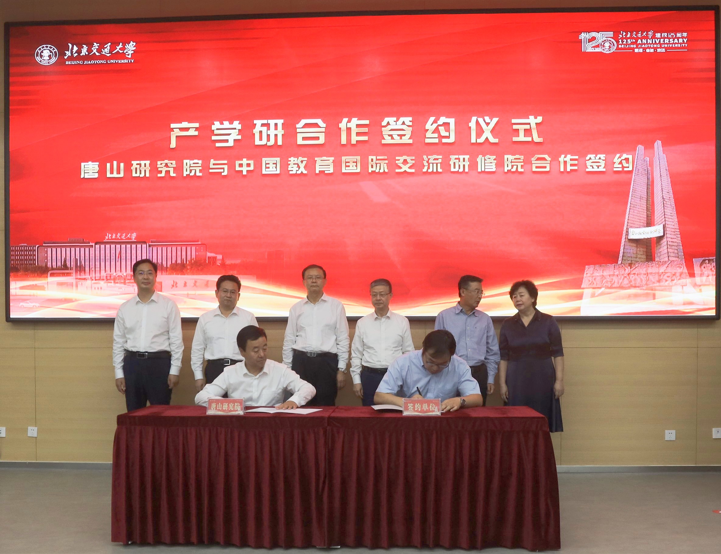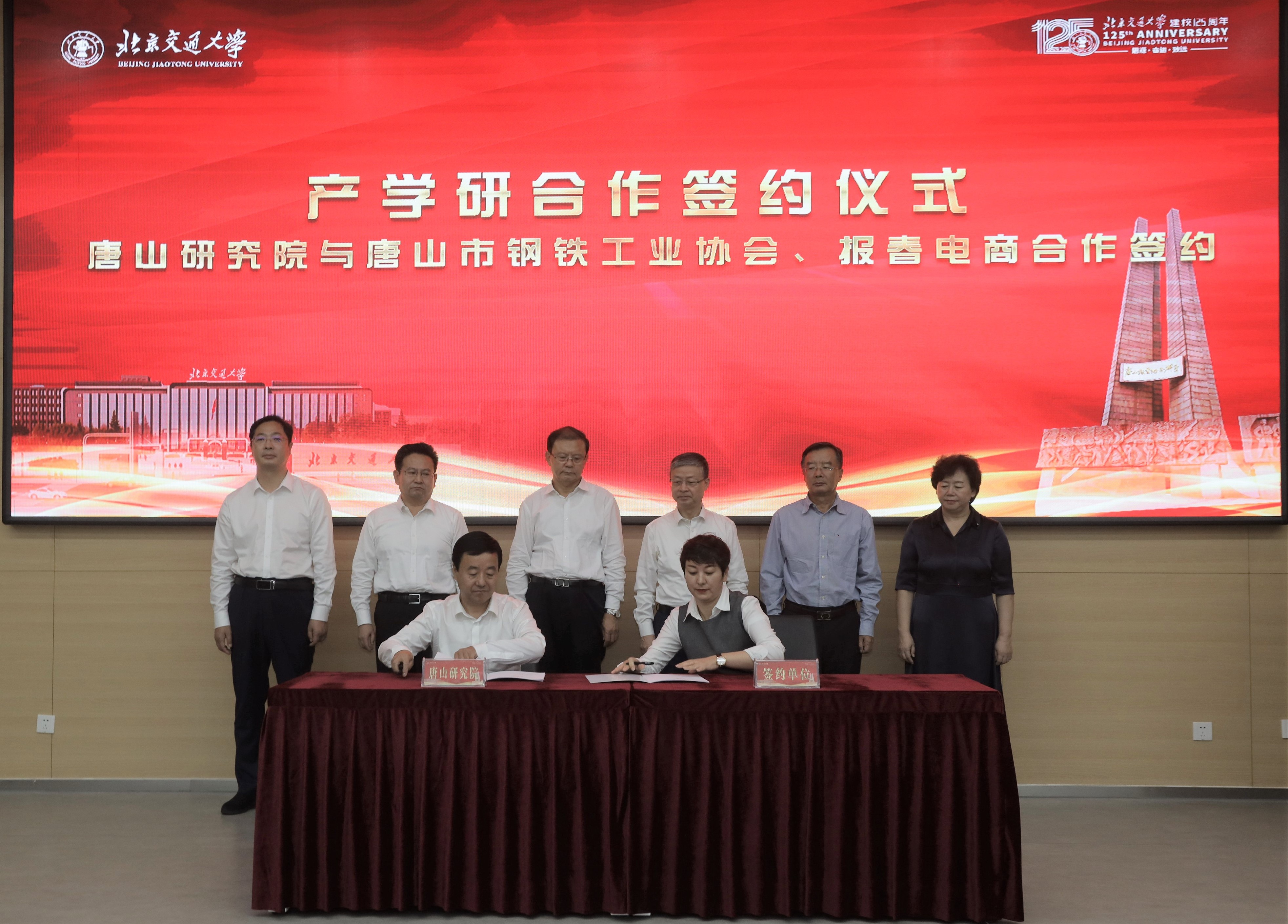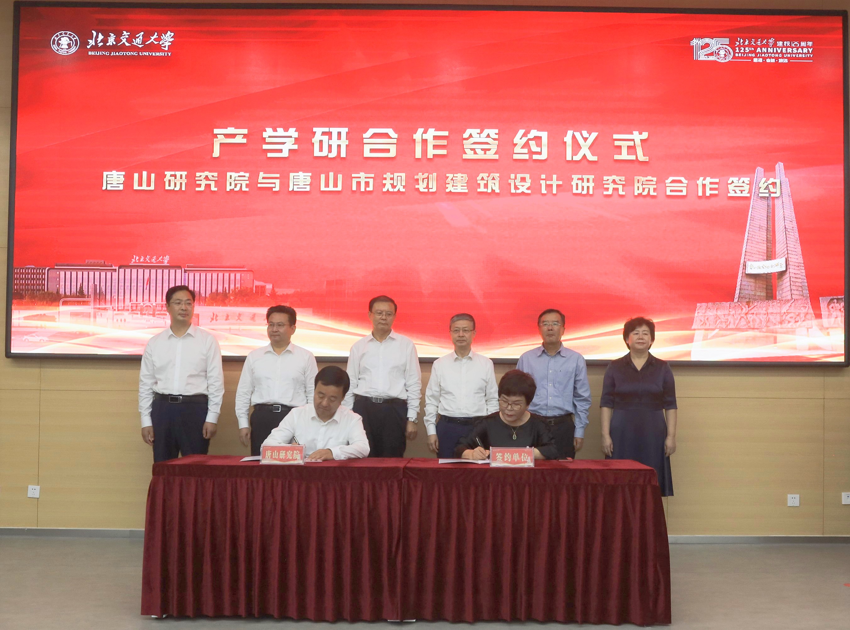 仪式上,校地双方主要领导共同为唐山研究院与产学研合作单位(中国汽车流通协会、中国教育国际交流协会研修学院、唐山市规划建筑设计研究院、中车唐山公司-北京唐车经贸有限公司、唐山市钢铁工业协会、唐山市报春电子商务股份有限公司、北京格学教育集团)证签。