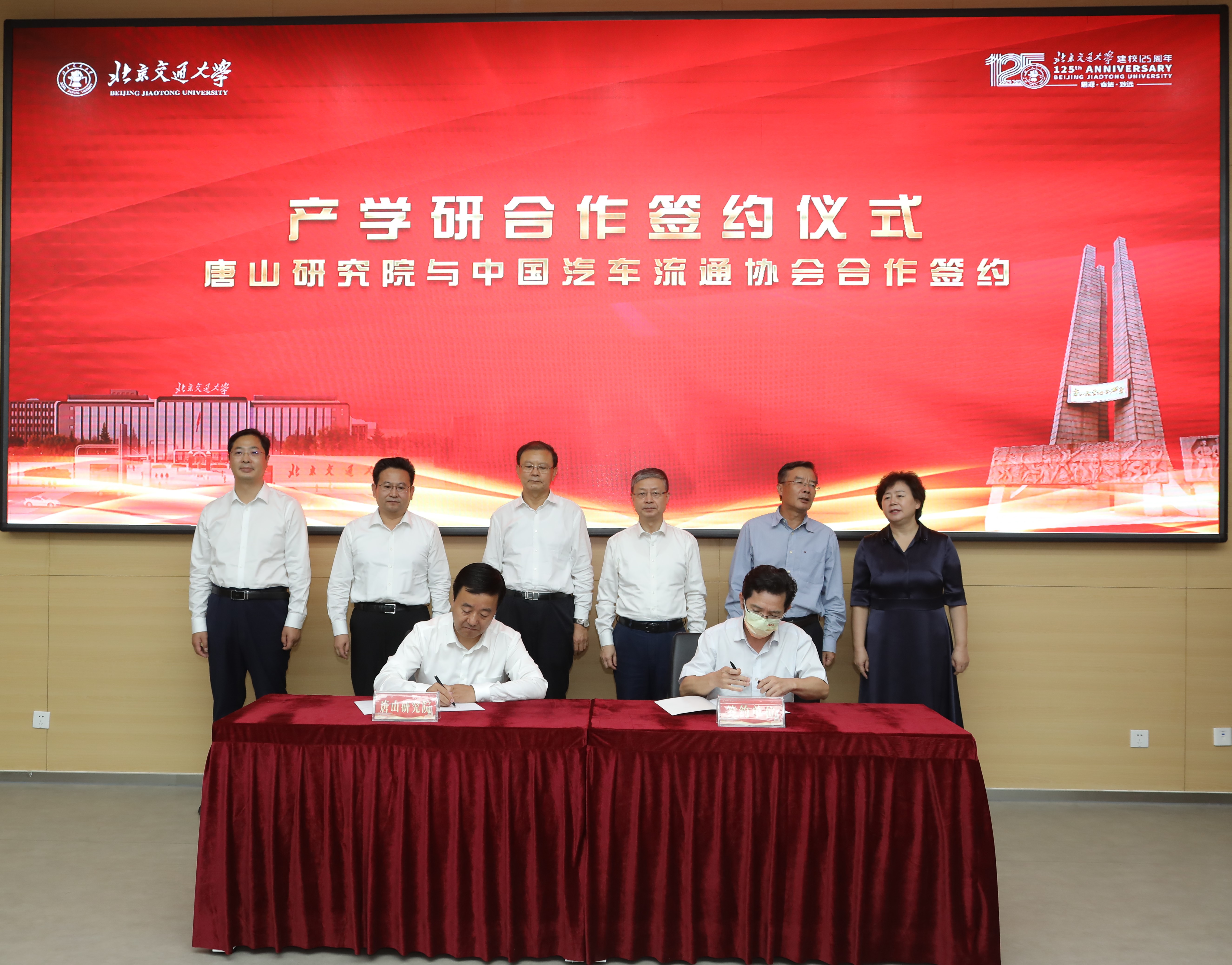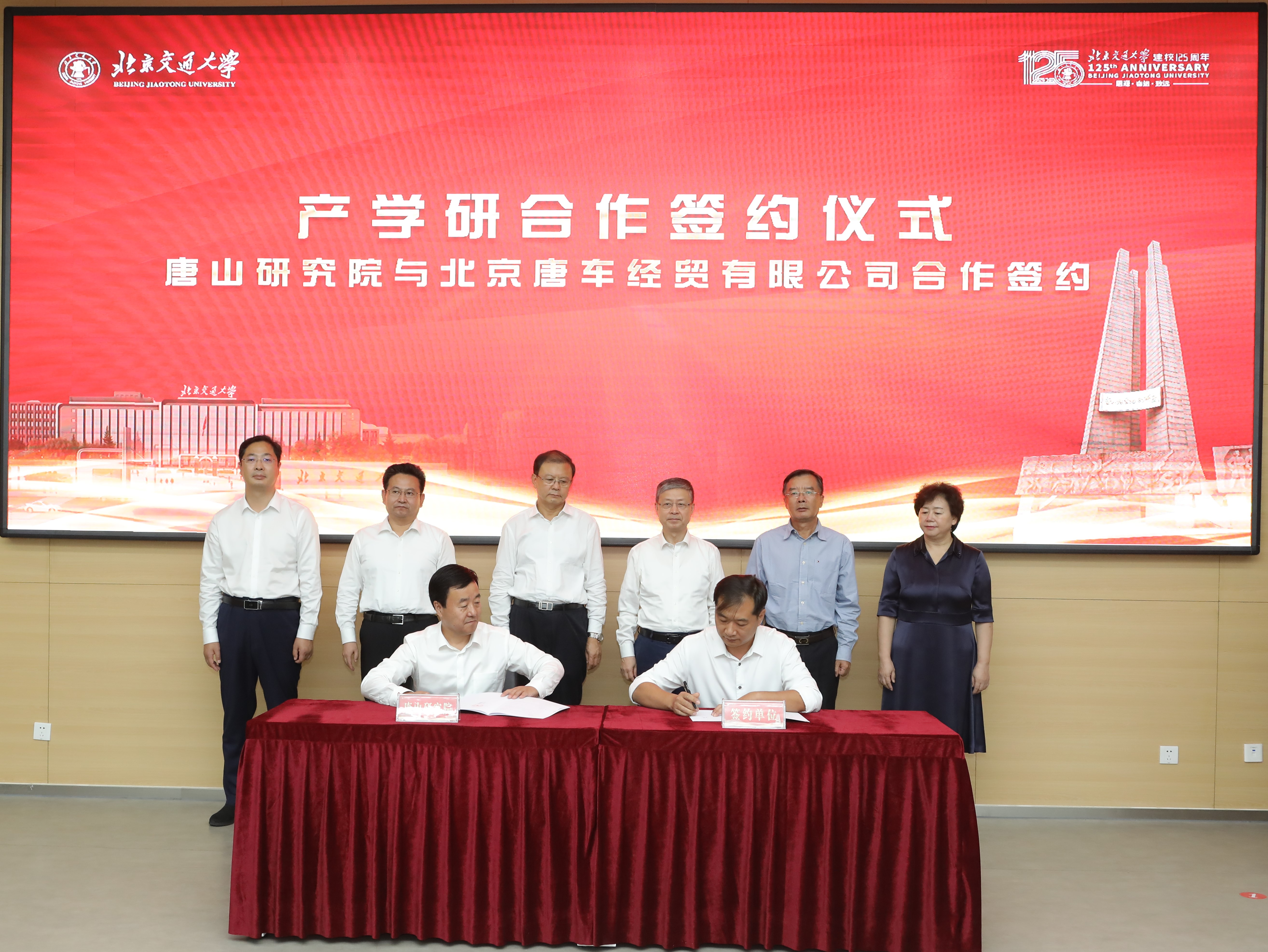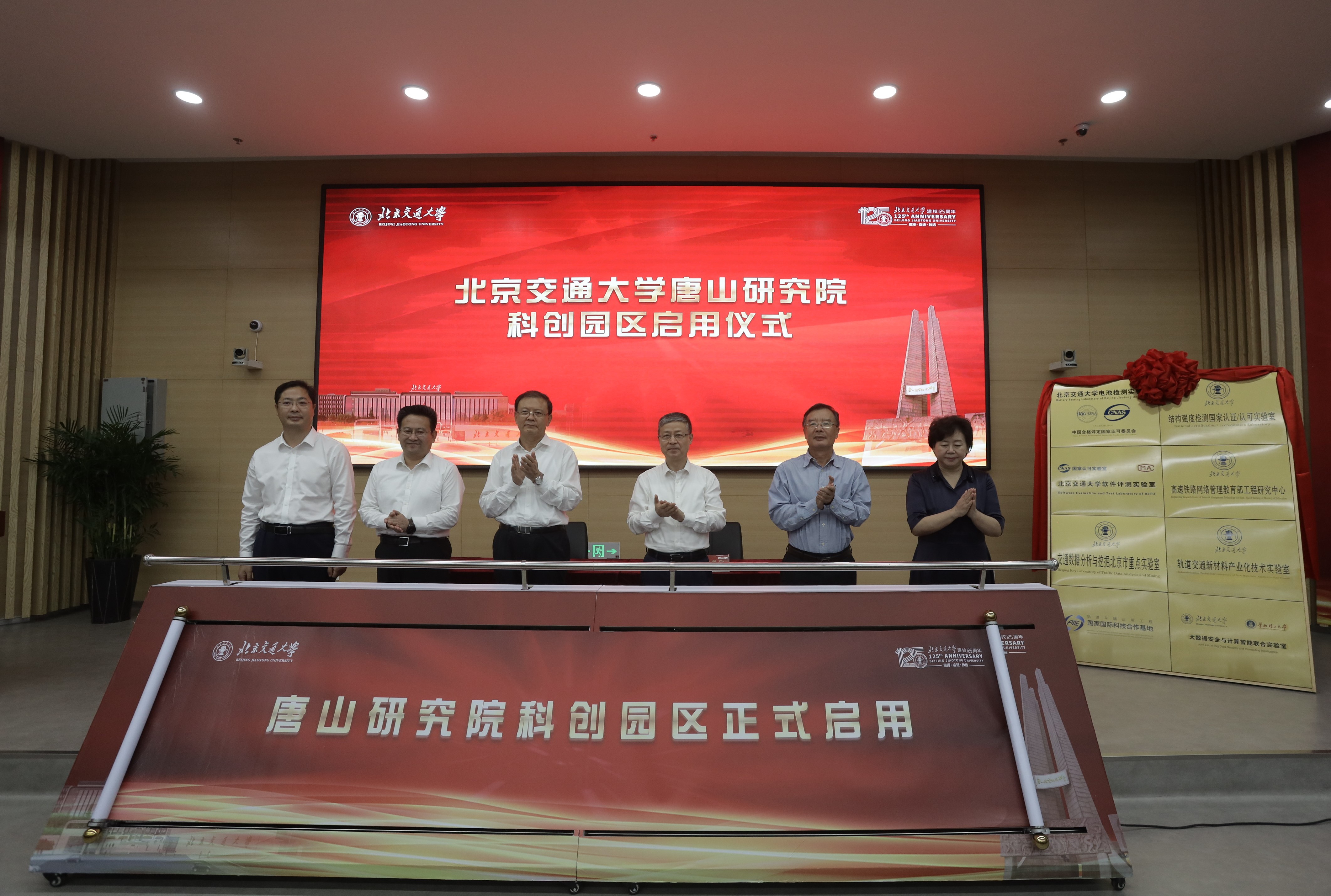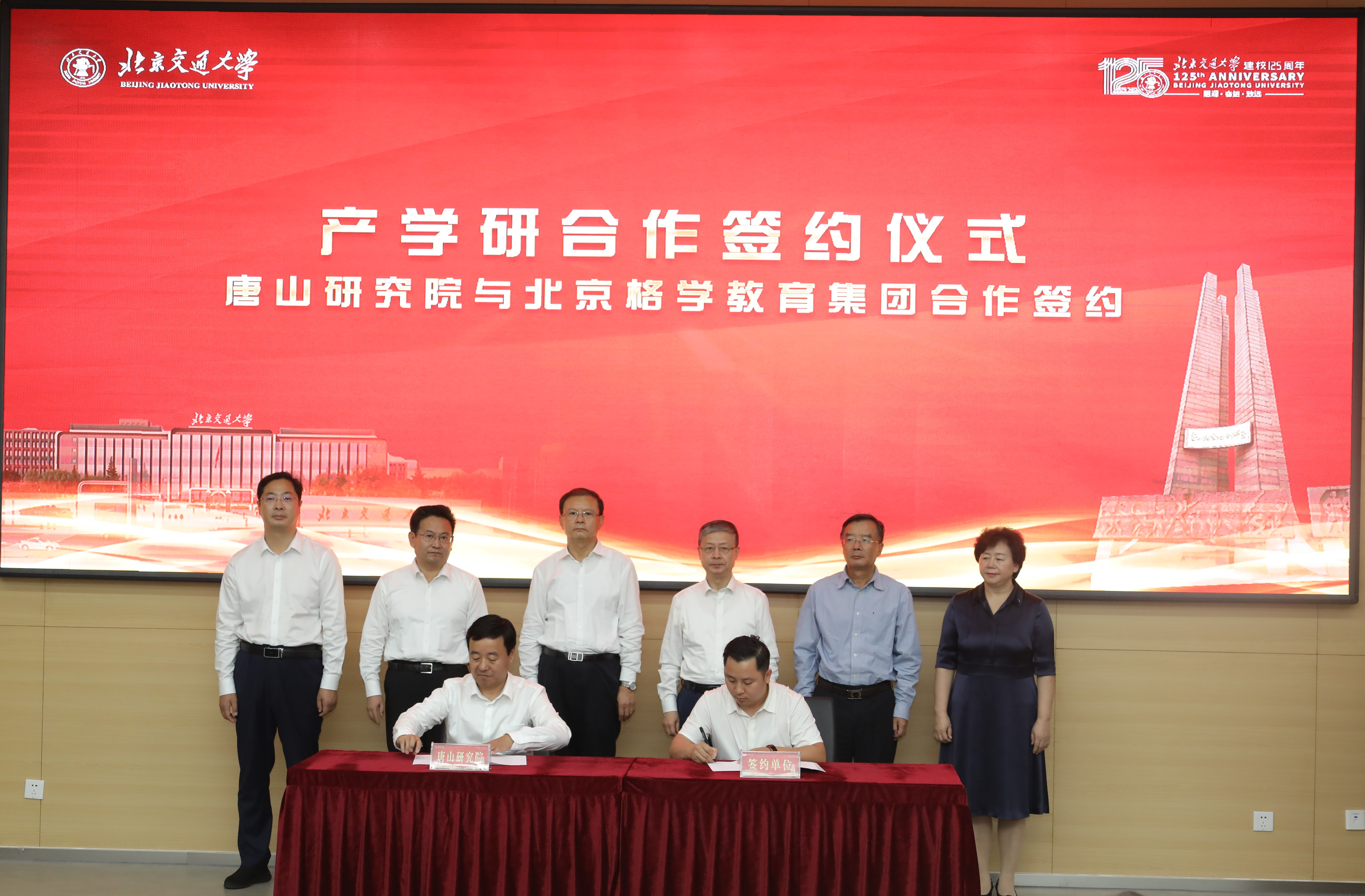 仪式上,校地双方主要领导共同为唐山研究院与产学研合作单位(中国汽车流通协会、中国教育国际交流协会研修学院、唐山市规划建筑设计研究院、中车唐山公司-北京唐车经贸有限公司、唐山市钢铁工业协会、唐山市报春电子商务股份有限公司、北京格学教育集团)证签。