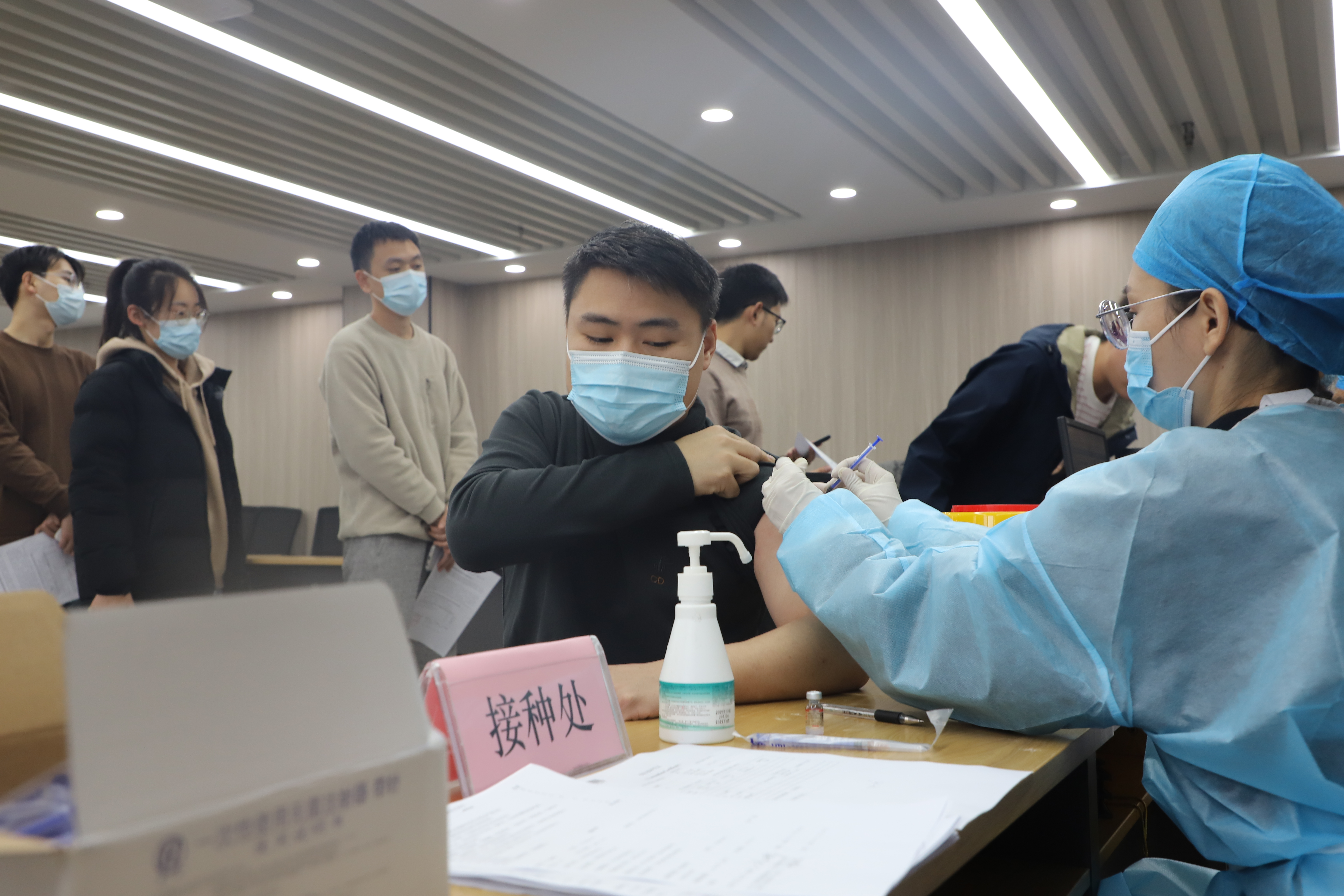 研究院统筹规划,指派专人、划定地点并制定疫苗接种专项工作方案。加强针接种现场,在研究院工作人员和医护人员的引导下,师生们从入门测量体温、知情同意书签写,到登记台信息核对、接种、留观、离场,接种全程井然有序,师生严格遵守防疫要求,身体力行表达疫情防控从自身做起的决心。
